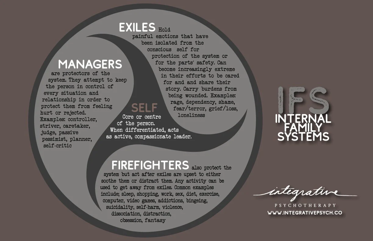 IFS is based on the idea that we all have different "parts" within us, each with its own thoughts, feelings, and roles. Some parts carry wounds from past experiences (exiled parts), while others take on protective roles to prevent further harm (managers and firefighters). I typically explain it as how we are not the same people at work as we are at home with our loved ones. Even though, in essence, we are the same person, we have to channel very different parts to ourselves depending on the context as what we need.